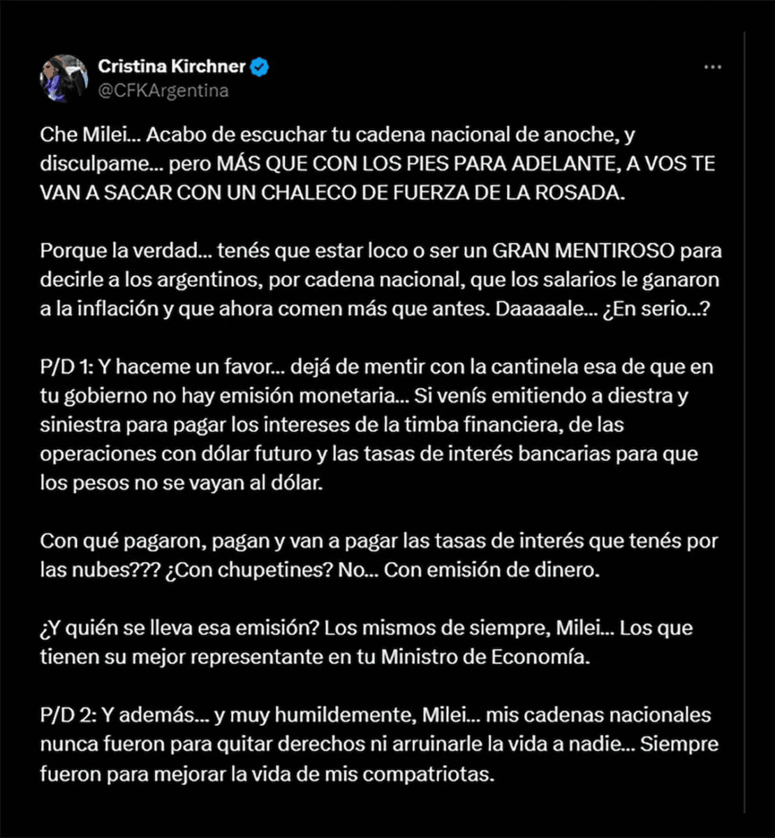 Para finalizar, la ex mandataria sintentizó: “P/D 2: Y además… y muy humildemente, Milei… mis cadenas nacionales nunca fueron para quitar derechos ni arruinarle la vida a nadie… Siempre fueron para mejorar la vida de mis compatriotas”.