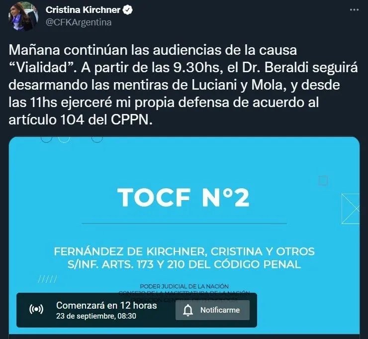 Junto al posteo, la Vicepresidenta adjuntó el video del Tribunal Oral en lo Criminal Federal de la Ciudad Autónoma Buenos Aires N.º 2, que emitirá este viernes a las 8.30 la ya menciona audiencia donde, finalmente, la ex Presidenta se defenderá ante la Justicia, en su condición de abogada.