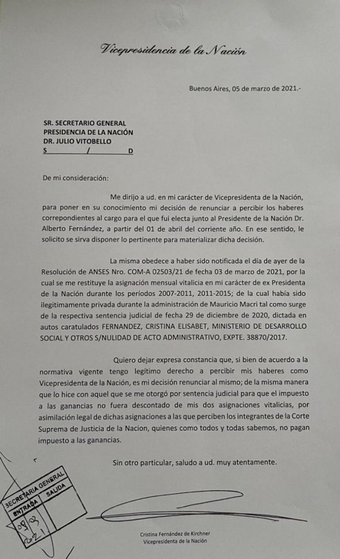 En su carta a Vitobello, Cristina Kirchner renuncia a su sueldo de vicepresidenta pero además expresa que también ha renunciado al beneficio de no pagar impuesto a las ganancias.