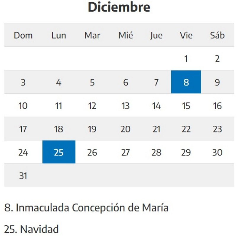 De esta manera, según el calendario oficial, el próximo feriado será el viernes 8 de diciembre, por el Día de la Inmaculada Concepción de María, y conformará un fin de semana largo de tres días.