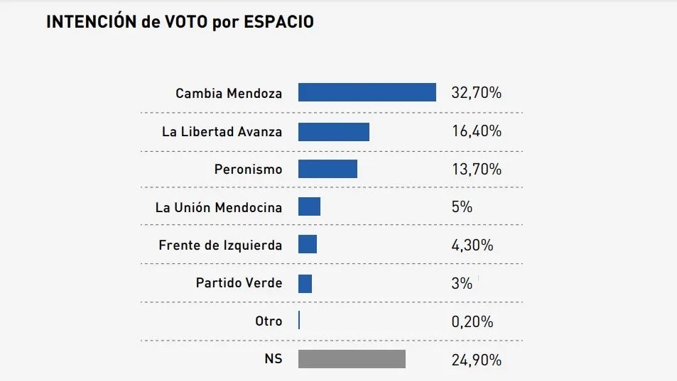 Además, el informe evaluó la intención de voto hacia los distintos espacios políticos. Cambia Mendoza lidera con el 32,7%, seguido por La Libertad Avanza con el 16,4%, y en tercer lugar se posiciona el peronismo con el 13,7%.