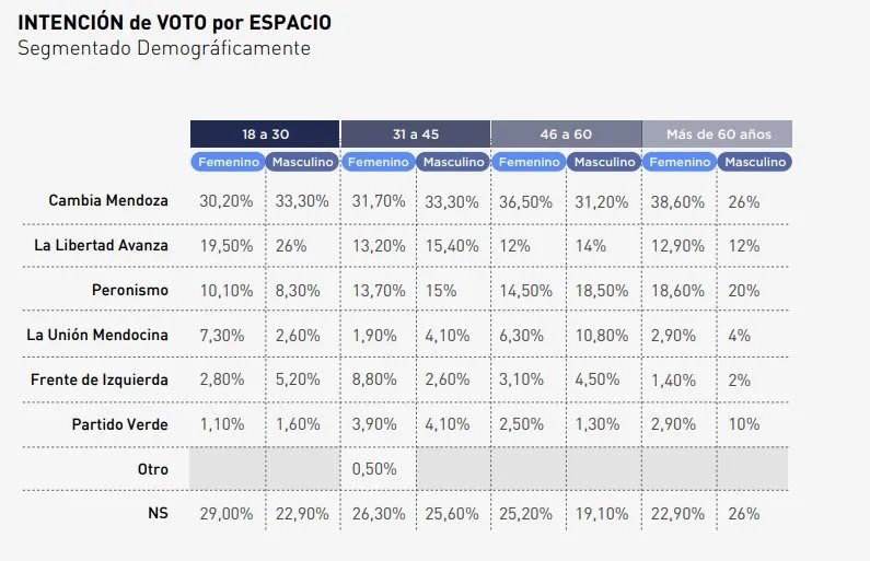 El análisis segmentado por edad y nivel socioeconómico reveló algunas diferencias en las preferencias. Cambia Mendoza mantiene un apoyo superior al 30% en todos los grupos, pero destaca especialmente en los sectores de mayores ingresos.