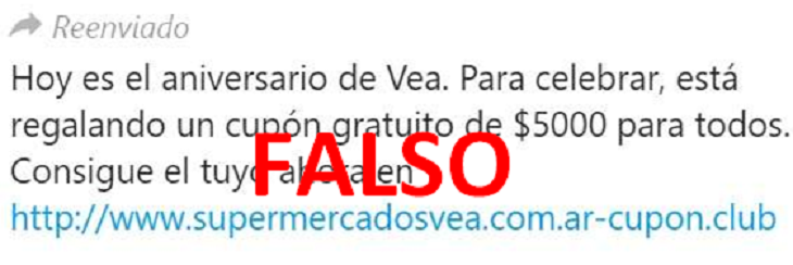 “Hoy es el aniversario de Vea. Para celebrar, está regalando un cupón gratuito de $5000 para todos. Consigue el tuyo ahora en supermercadosvea.com.ar-cupon.club”, cita el mensaje que le llegó a varios mendocinos.