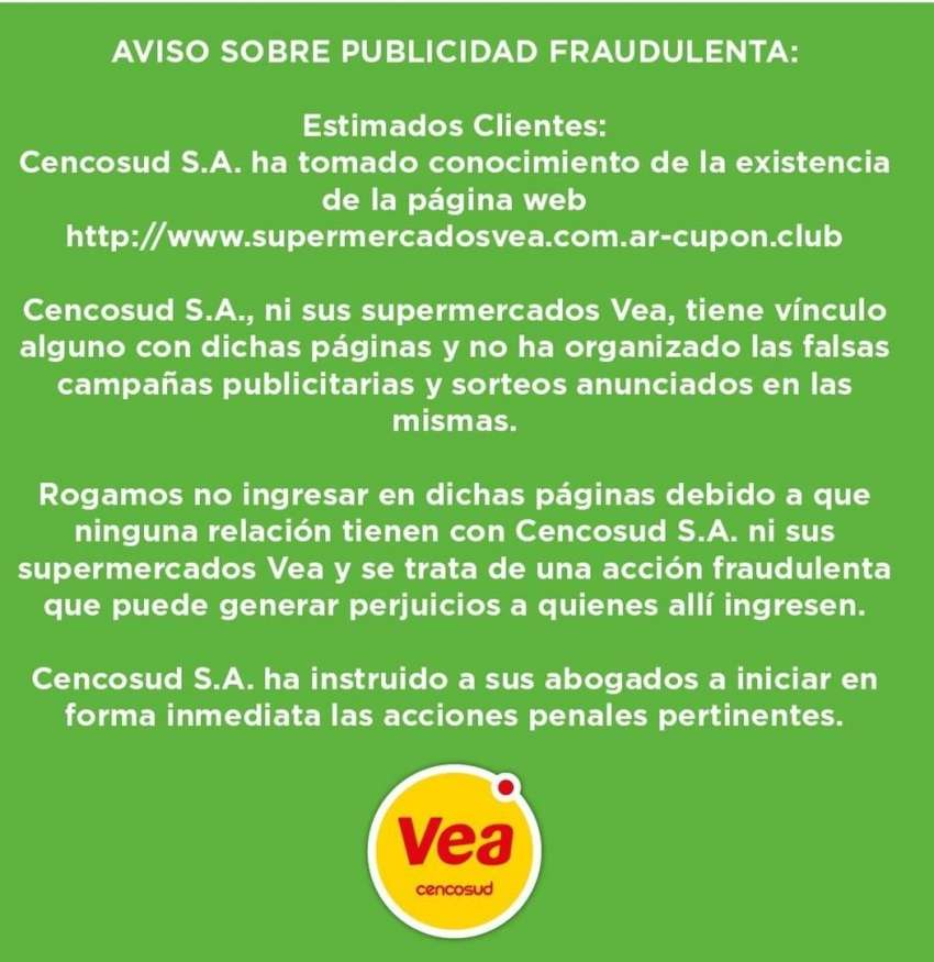 “Cencosud S.A ni sus supermercados Vea tienen vínculo alguno con dicha página y no ha organizado las falsas campañas publicitarias o promocionales y sorteos anunciados en las mismas”, explicaron a través de un comunicado.