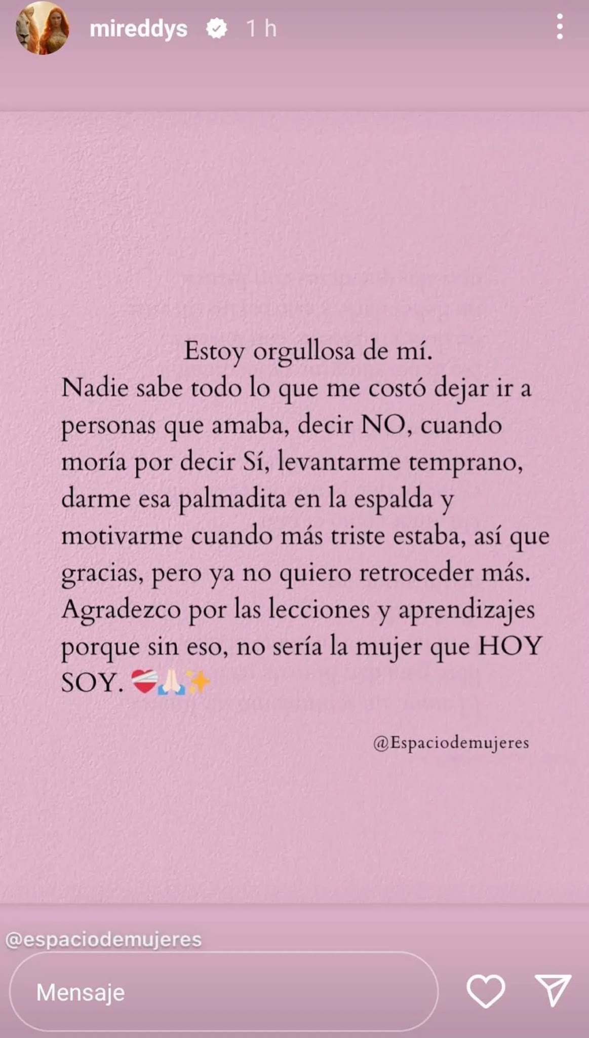 “Estoy orgullosa de mí. Nadie sabe todo lo que me costó dejar ir a personas que amaba, decir no cuando moría por decir sí. Levantarme temprano, darme esa palmadita en la espalda y motivarme cuando más triste estaba. Así que gracias, pero ya no quiero retroceder más. Agradezco por las lecciones y aprendizajes, porque sin eso no sería la mujer que hoy soy”, sostuvo a través de una imagen.