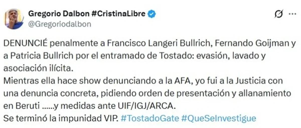 “Denuncié penalmente a Francisco Langeri Bullrich, Fernando Goijman y a Patricia Bullrich por el entramado de Tostado: evasión, lavado y asociación ilícita. Mientras ella hace show denunciando a la AFA, yo fui a la justicia con una denuncia concreta, pidiendo orden de presentación y allanamiento en Beruti y medidas ante la Unidad Información Financiera (UIF), la Inspección General de Justicia (IGJ) y la Agencia de Recaudación y Control Aduanero (ARCA)”, manifestó Dalbón.