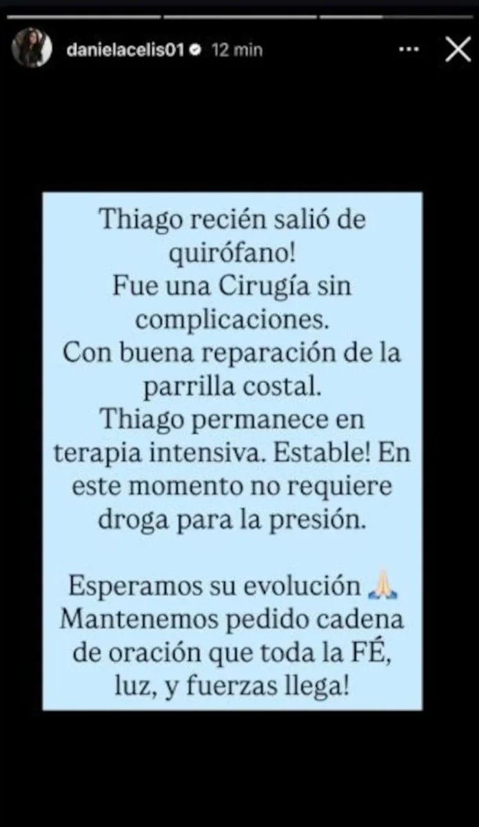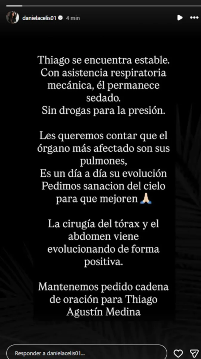 Acto seguido, se refirió a la operación a la que fue sometido el pasado viernes y precisó: “La cirugía del tórax y el abdomen viene evolucionando de forma positiva”. “Mantenemos pedido cadena de oración para Thiago Agustín Medina”,concluyó.