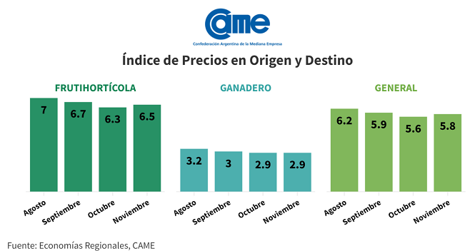 Participación del productor en el precio final: bajó 0,6 puntos porcentuales en noviembre, de 25,7% a 25,1%.