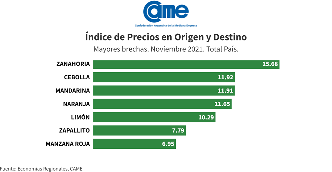 ● En noviembre, la mayor brecha entre precio de origen y destino se dio en la zanahoria, con una diferencia de 15,7 veces, ampliando en casi 5 puntos la brecha frente a octubre (10,8 veces). Le siguió la cebolla (11,9 veces), la mandarina (11,9 veces) y la naranja (11,7 veces).