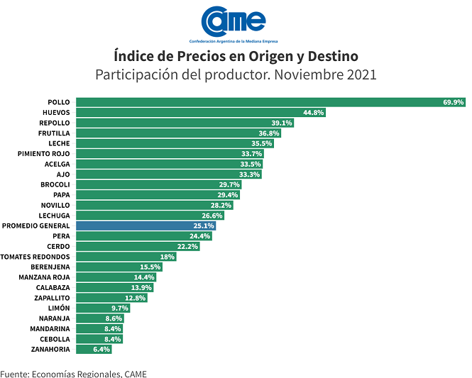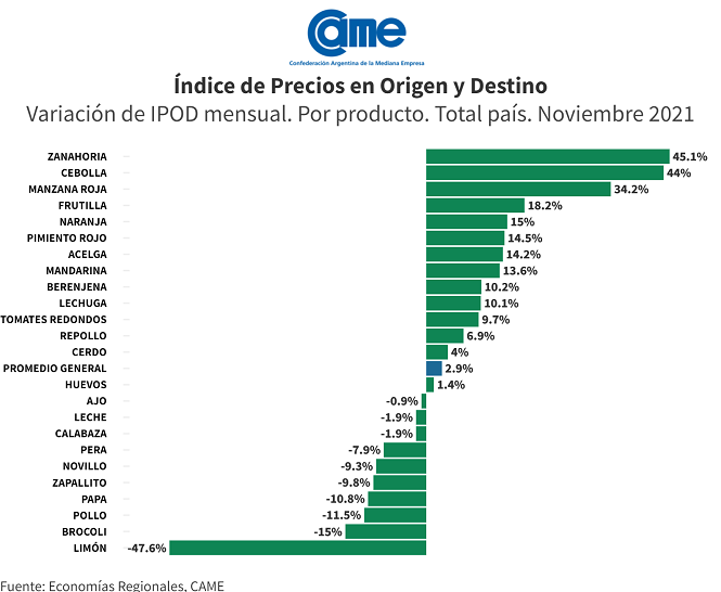 ● Los datos surgen del Índice de Precios en Origen y Destino (IPOD) que elabora el sector de Economías Regionales de CAME en base a los precios de origen de las principales zonas de producción y a más de 700 precios de cada producto en destino, relevados no sólo en verdulerías y mercados por un equipo de 30 encuestadores, sino también mediante un monitoreo de los precios online de los principales hipermercados del país, durante la segunda quincena del mes.