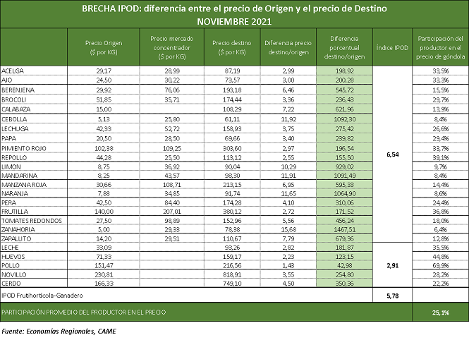 El IPOD es un indicador elaborado por el sector de Economías Regionales de CAME para medir las distorsiones que suelen multiplicar por varias veces los precios de los productos agropecuarios, desde que salen del campo hasta que llegan al consumidor. Estas distorsiones son muy dispares según producto, región, forma de comercialización y época del año.