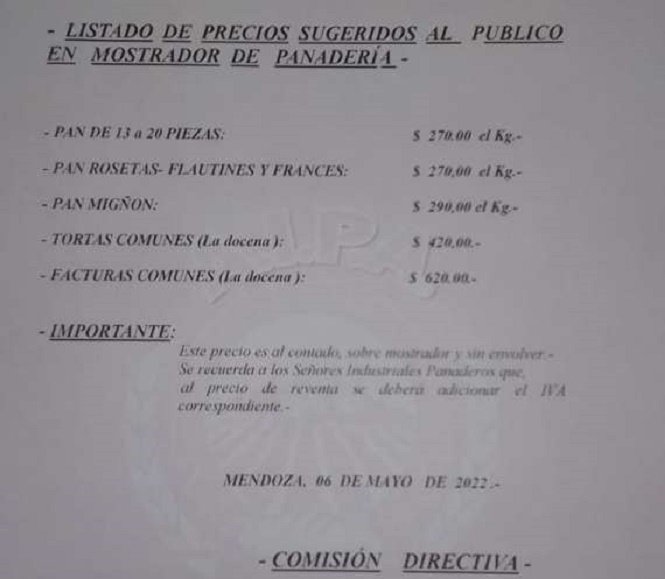 La Asociacion de Industriales Panaderos y Afines en Mendoza publicó este jueves la lista de precios sugeridos que comenzará a regir a partir del 6 de mayo manteniendo el acuerdo que se realizó con el gobierno de mantener al pan francés en $270 kg.