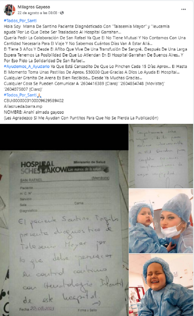 En un despreciable acto de engaño y estafa, Anahí Almada Gayoso, bajo el nombre falso de Milagros Gayoso en Facebook, ha estado lucrando con la salud de Santino Trigilio, un niño sanrafaelino diagnosticado con “Talasemia Mayor”. El hecho salió a la luz cuando La Ventana San Rafael recibió una denuncia de uno de sus lectores, alertando sobre esta vergonzosa práctica.