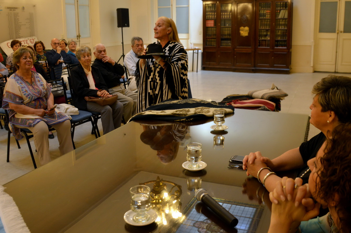 Beatriz explicó detalladamente la morfología de los distintos ponchos y su relación con su origen, que va desde lo simbólico, -como el rojo que representa la sangre o los funerarios donde prevalece el negro-, hasta lo práctico como los azules de los ponchos patagónicos que se notan en medio de la nieve, la cobertura contra los mosquitos de los del noreste o la gran longitud de los usados por los arrieros.