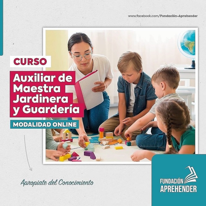La Fundación Aprehender dicta cursos online para Auxiliar de Maestra Jardinera y Guardería con una duración de 8 meses.