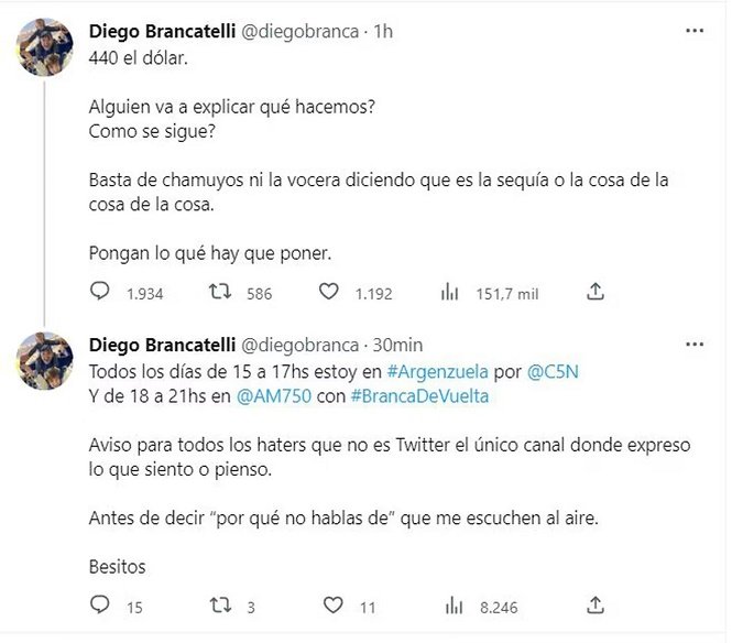 Diego Brancatelli se mostró furioso en Twitter por la escalada del dólar que se registró durante las últimas horas. “440 el dólar. ¿Alguien va a explicar qué hacemos? ¿Cómo se sigue?”, escribió el periodista en la red social del pajarito.