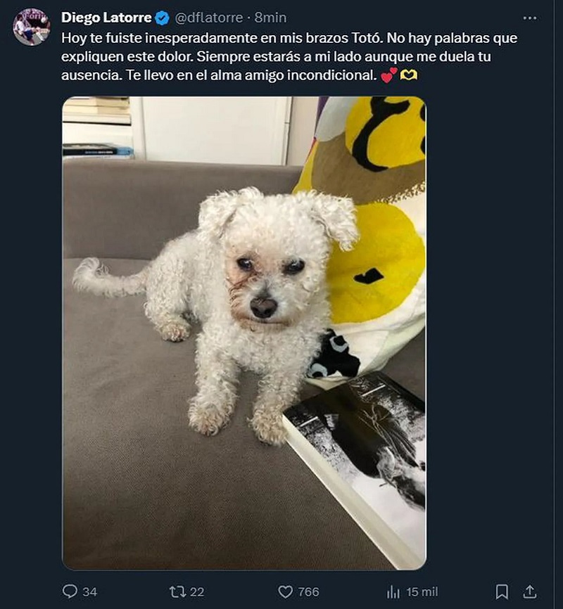 “Hoy te fuiste inesperadamente en mis brazos, Totó. No hay palabras que expliquen este dolor. Siempre estarás a mi lado aunque me duela tu ausencia. Te llevo en el alma, amigo incondicional”, escribió Latorre en Twitter junto a una foto del caniche que murió con 15 años.