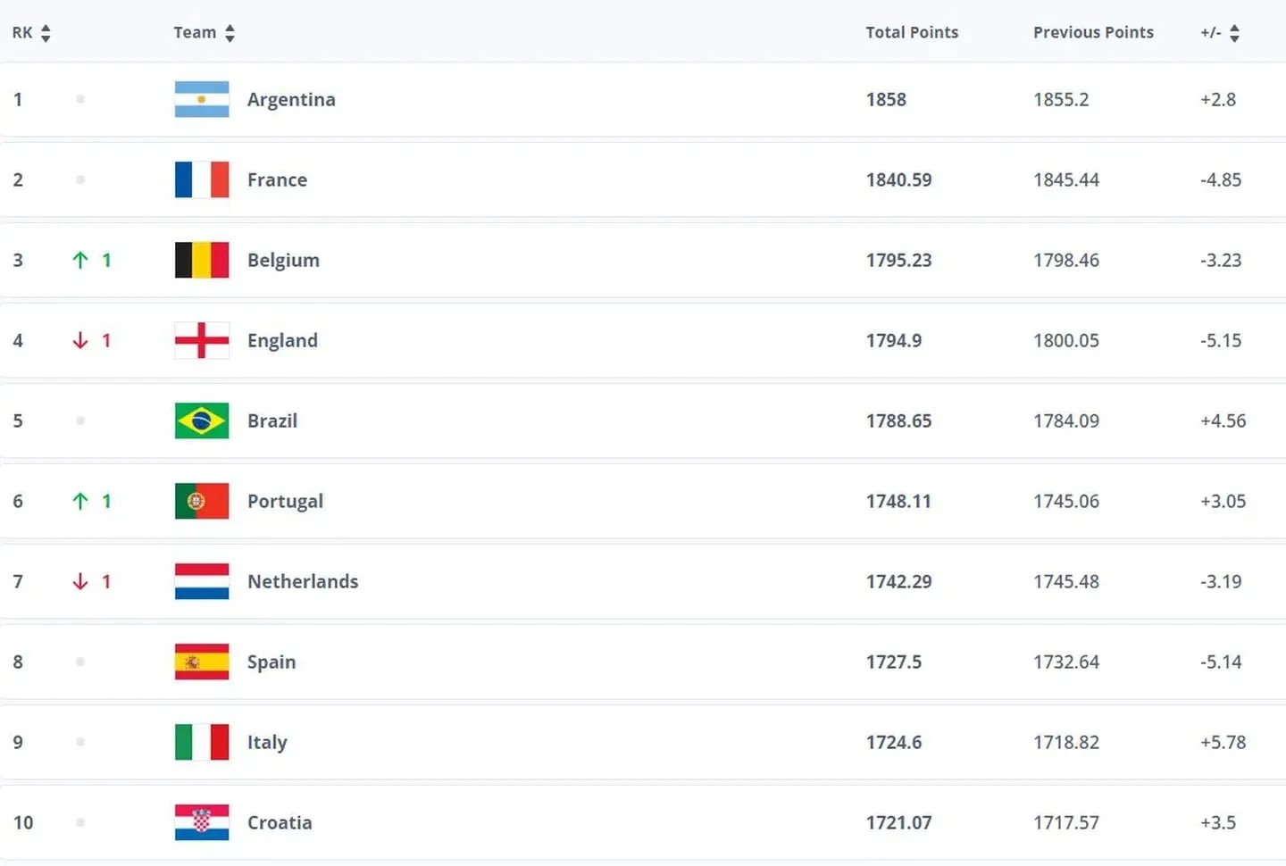 Por su parte Brasil quedó en quinta posición mientras que Portugal escaló un puesto (6º) y Países Bajos lo descendió (7º). Estados Unidos (11º) y Colombia (12º) también subieron dos escalones y México mejoró uno (14º). Uruguay, en cambio, cayó cuatro posiciones (15º).