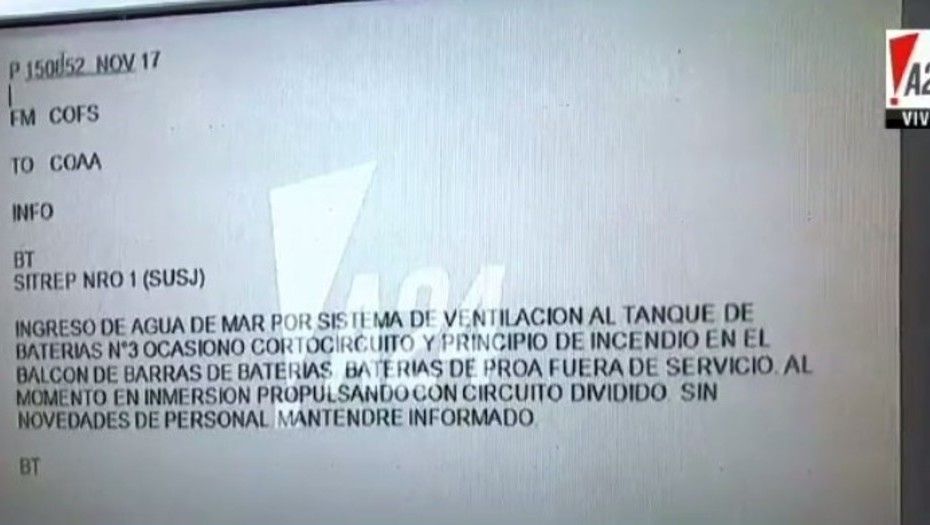 La última vez que el capitán del submarino ARA San Juan se comunicó con la base naval informaron sobre las averías de la embarcación. “Ingreso de agua de mar por sistema de ventilación al tanque de baterías N°3 ocasionó cortocircuito y principio de incendio en el balcón de barras de baterías. Baterías de proa fuera de servicio. Al momento en inmersión propulsando con circuito dividido. Sin novedades de personal mantendré informado”, decía el escrito.