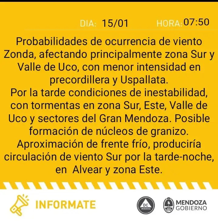 Además, el Servicio Meteorológico Nacional (SMN) ha emitido una alerta por viento Zonda, que afectará la precordillera de Las Heras, Luján de Cuyo, Valle de Uco y la zona baja de Malargüe. También hay alerta por tormentas aisladas con posibilidad de caída de granizo en las zonas sur, este, Valle de Uco y algunos sectores del Gran Mendoza.