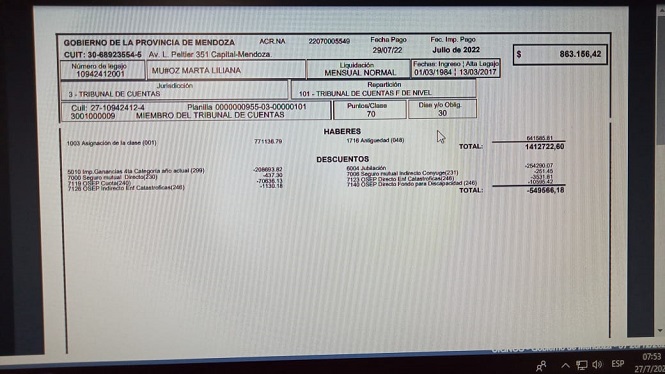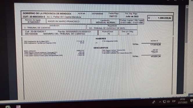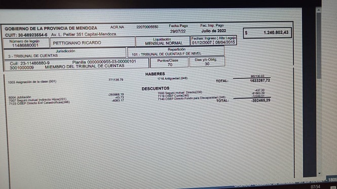 Una cosa es un “salario digno”, y otra muy distinta es cobrar cifras que le darían de comer a alrededor de 20 personas si se comparan los sueldos. Lo más grave de la cuestión, es que ambas cifras surgen de las arcas del Estado provincial y no de una compañía multinacional que desea congraciar todos los meses a sus empleados. Tal es el caso del presidente del Tribunal de Cuentas de Mendoza, quien está ganando $1.272.426,63 y que con los descuentos correspondientes, recibe de bolsillo $758.118,64.
