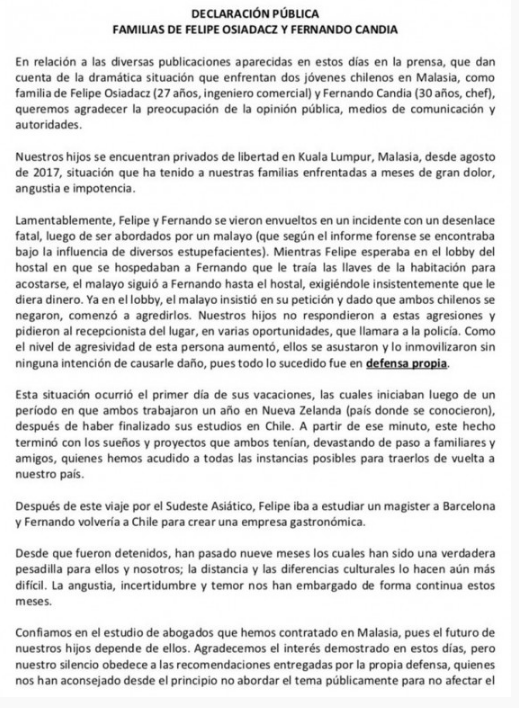 Osiadacz y Candia, que dejaron Chile al terminar sus estudios, llevan más siete meses en esa cárcel malasia y se comunican con sus padres a través de cartas. Pocas semanas atrás recibieron un trato especial: por primera vez pudieron hablar por teléfono con sus familias, sin evitar romper en llanto.