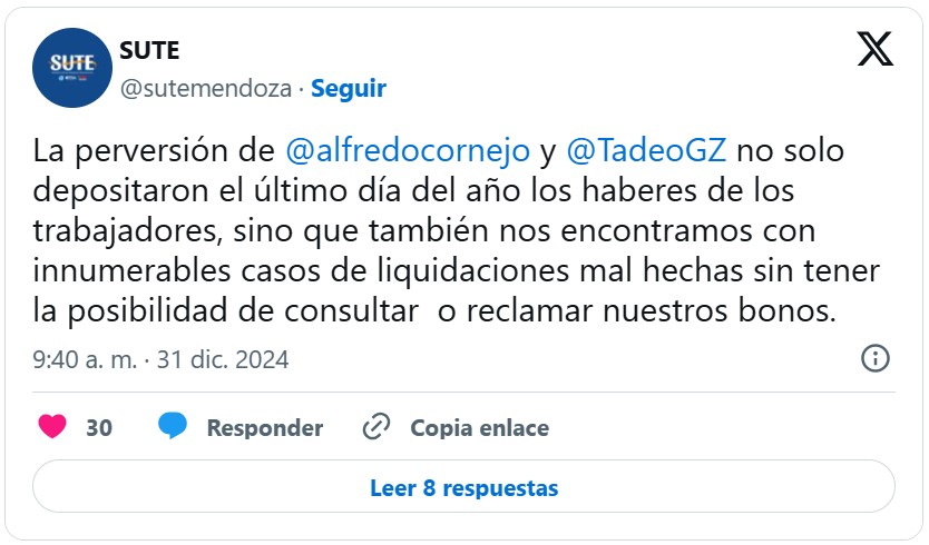 Mediante un comunicado, el gremio de Judiciales expresó su descontento hacia la administración provincial y señaló directamente al gobernador Alfredo Cornejo. “Denunciamos públicamente el ultraje cometido por el gobernador Alfredo Cornejo, quien depositó mal el día de cobro con la intención de precarizar a los trabajadores del Estado. Este acto cobarde y antidemocrático, cometido juste el último día del año, muestra una falta de respeto y consideración hacia los trabajadores que dependen de su salario para vivir”, señala el texto difundido por el sindicato.