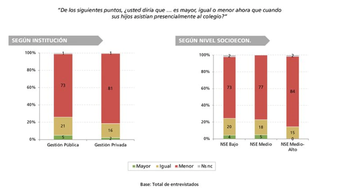 El nivel socio-económico también influye al momento de evaluar el impacto de la educación virtual y presencial. Los padres encuestados dijeron que la asistencia virtual en colegios privados -de lunes a viernes- es del 62 por ciento, mientras que en las escuelas públicas sólo alcanza al 32 por ciento.