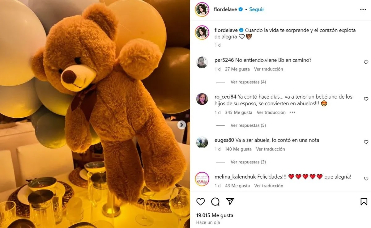 “Cuando la vida te sorprende y el corazón explota de alegría”, expresó en su mensaje en Instagram Flor de la V. Al comenzar el programa, la conductora confirmó: “Mamá no voy a ser, voy a ser abuela, tengo una emoción, una alegría…”.