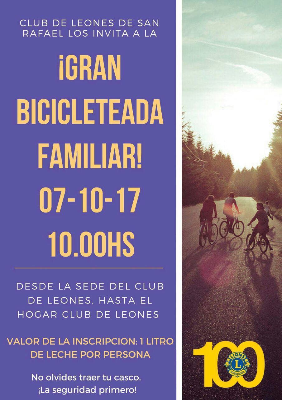El sábado 07 de octubre a las 10, con punto de partida en la sede del Club de Leones San Rafael (avenida Pedro Vargas 1588), habrá una bicicleteada que seguirá por Juan XXIII, por allí hasta Vélez Sarsfield, cruzarán todo el parque rumbo a Ejercito de los Andes y a 300 metros de la ruta hacia el Sur, será la llegada en el hogar de ancianos.