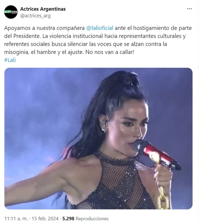 La agrupación de Actrices Argentinas compartió un comunicado en apoyo a la cantante. “Apoyamos a nuestra compañera Lali ante el hostigamiento de parte del Presidente. La violencia institucional hacia representantes culturales y referentes sociales busca silenciar las voces que se alzan contra la misoginia, el hambre y el ajuste. No nos van a callar”, dice el mensaje publicado en redes sociales.