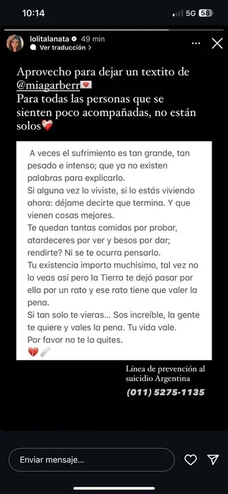 “Aprovecho para dejar un texto de Mia Garber para todas las personas que se sienten poco acompañadas, no están solos. A veces el sufrimiento es tan grande, tan pesado e intenso, que ya no existen palabras para explicarlo”, comenzó el mensaje que compartió Lola Lanata.