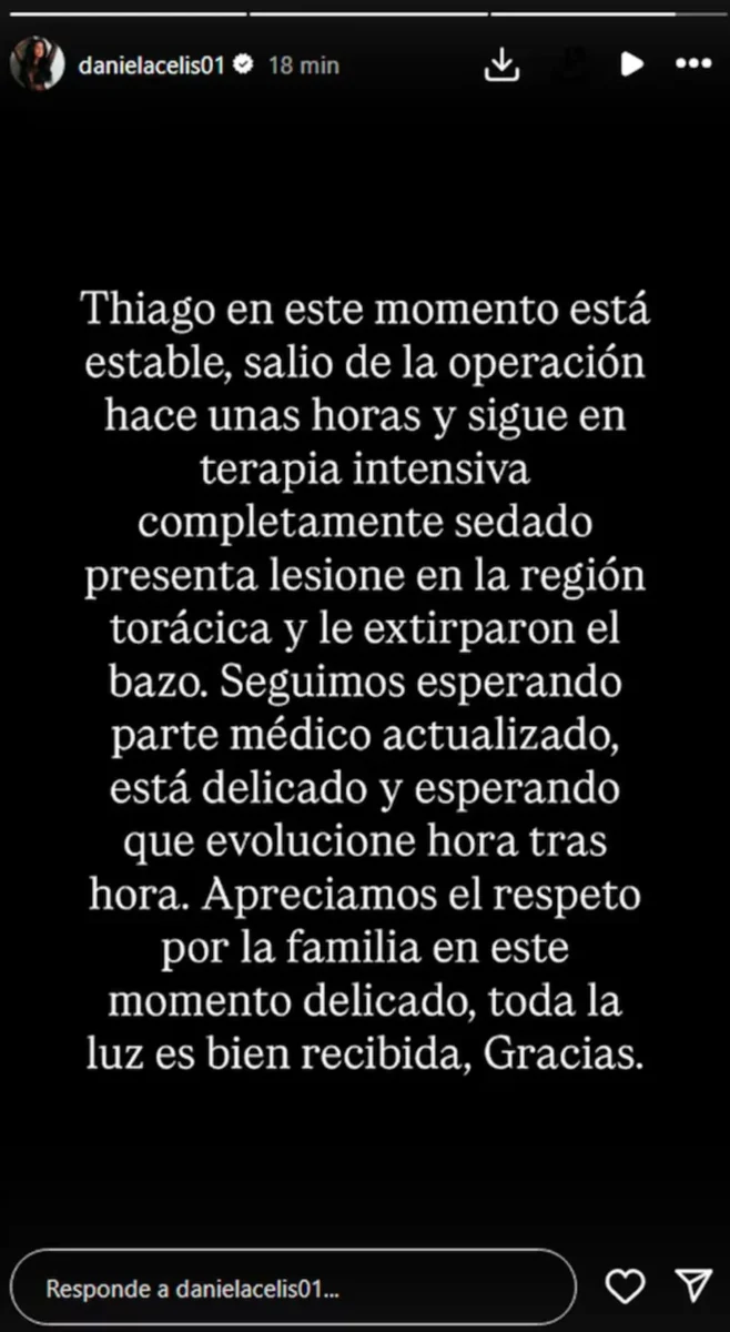 Tal como explicó Daniela Celis, el ex Gran Hermano “presenta lesiones en la región torácica y le extirparon el bazo”, y añadió: “Seguimos esperando parte médico actualizado, está delicado y esperando que evolucione hora tras hora. Apreciamos el respeto por la familia en este momento delicado, toda la luz es bien recibida, Gracias”.