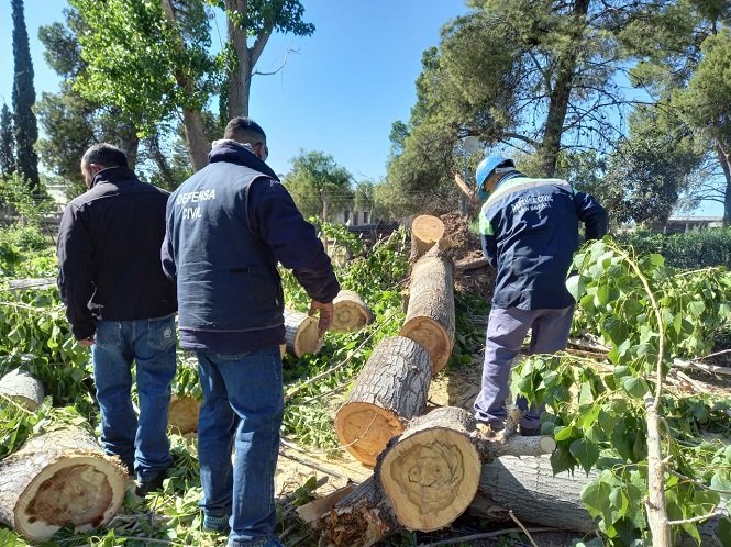 Otro trabajo mancomunado se ejecuta entre Defensa Civil, Servicios, Barriales, Distrito y Desarrollo Social, que por estas horas recolectan trozos de troncos y grandes ramas que quedaron al costado de calles, avenidas y rutas. Lo mismo hace Espacios Verdes en plazas y parques. Las tareas se efectúan en relación a llamados a bases operativas y recorridas que están haciendo distintos equipos municipales después de la primera etapa de trabajos ejecutados el domingo.