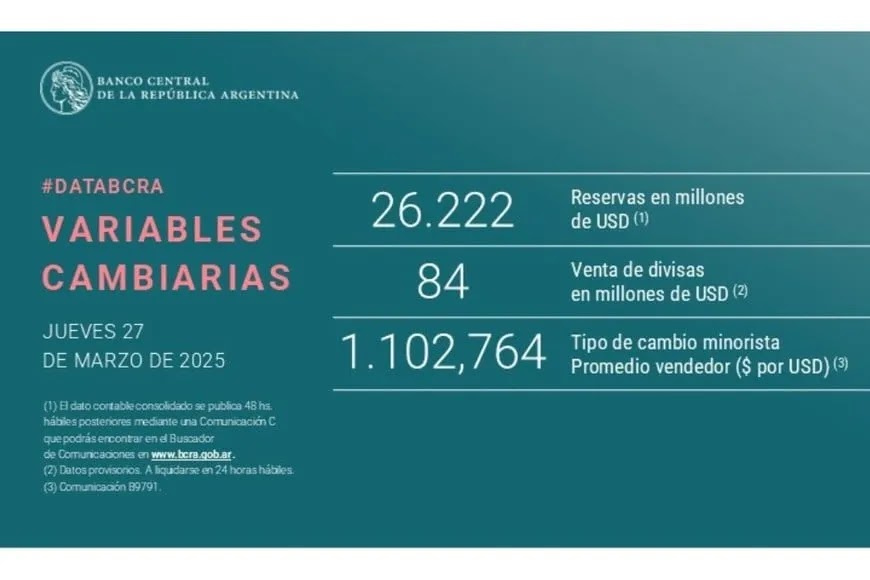 En paralelo, el Banco Central de la República Argentina (BCRA) volvió a terminar este jueves 27 de marzo con saldo negativo su participación en el mercado oficial de cambios.