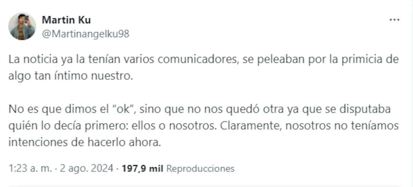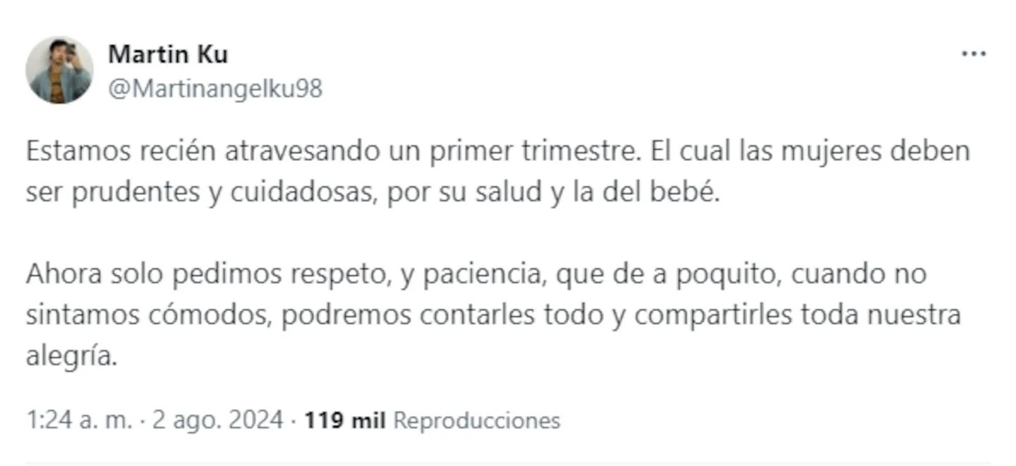 La noticia de que la pareja esperaba su primer hijo se filtró a comienzos de mes. Martín Ku estalló de bronca en sus redes sociales: “Alguien del hospital dio la información”.