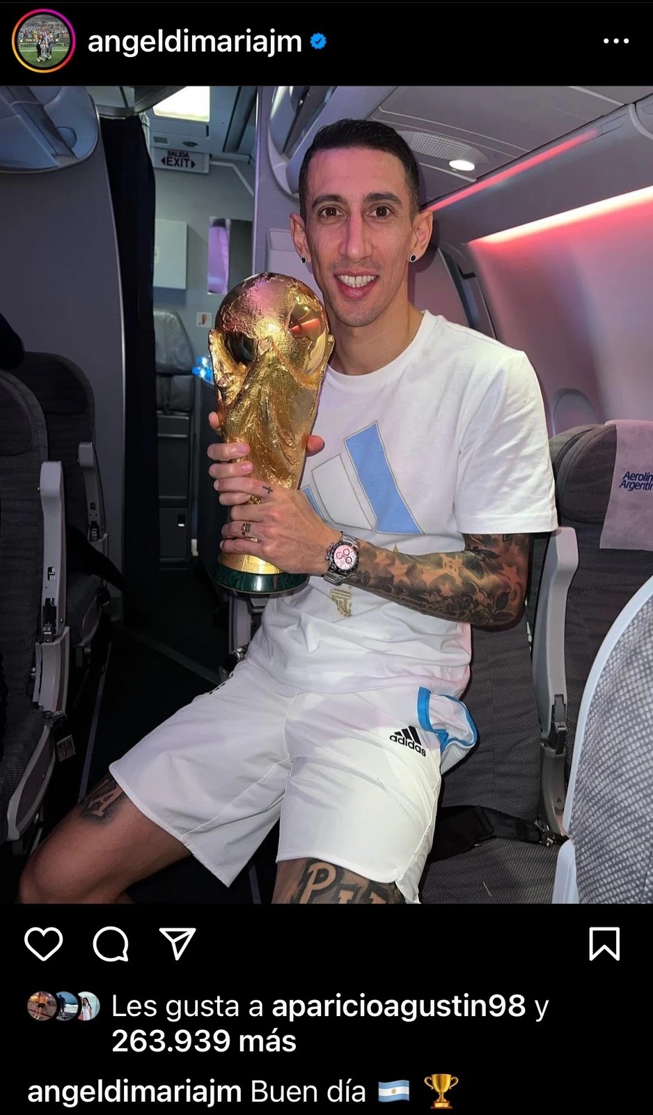 Uno de los jugadores que más anhelaba levantar la copa fue Ángel Di María quién también festejó el triunfo desde el avión que trae de vuelta a la Selección y subió una foto donde también saludó a los argentinos.