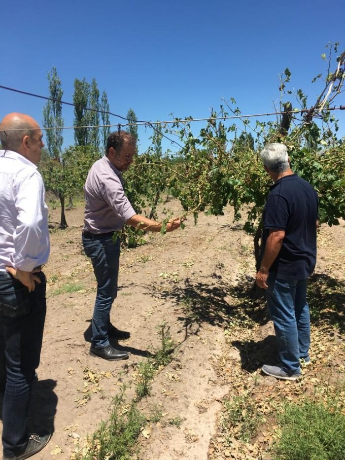 Luego de recorrer las fincas de San Rafael, que padecieron los efectos de la granizada del viernes, el subsecretario de Agricultura y Ganadería, Alejandro Zlotolow comprometió la entrega de oxicloruro para curar rápidamente las plantas afectadas por la piedra, como una primera medida de emergencia.