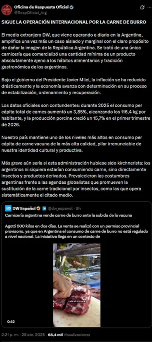 Para comenzar, explicó que “el medio extranjero DW, que viene operando a diario en la Argentina, amplifica una vez más un caso aislado y marginal con el claro propósito de dañar la imagen de la República Argentina”, aclarando que “se trató de una única carnicería que comercializó una cantidad mínima de un producto absolutamente ajeno a los hábitos alimentarios y a la tradición gastronómica de los argentinos”.