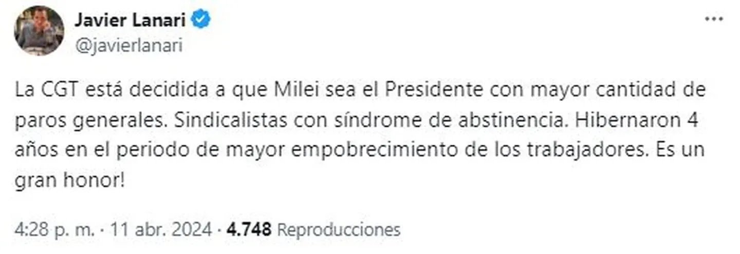 Javier Lanari, subsecretario de prensa en la presidencia de la Nación, se pronunció en X (antes Twitter): “La CGT está decidida a que Milei sea el Presidente con mayor cantidad de paros generales. Sindicalistas con síndrome de abstinencia. Hibernaron 4 años en el periodo de mayor empobrecimiento de los trabajadores. ¡Es un gran honor!”.