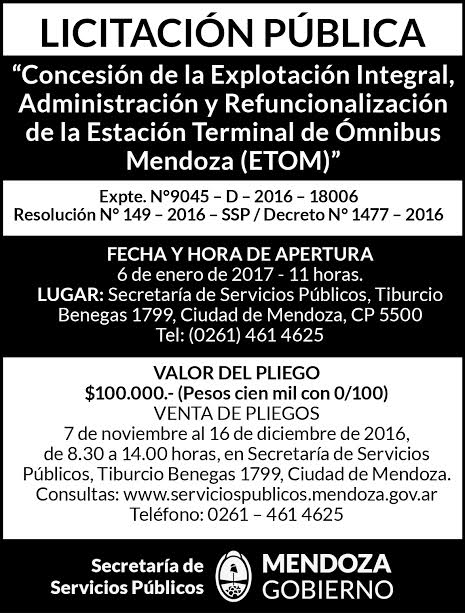 Después de un trabajo de auditoria por parte de la Secretaría de Servicios Públicos, y tras constatar que tanto las condiciones de todo el predio como la prestación de los diferentes servicios eran totalmente precáreas y obsoletas, el Gobierno de Mendoza lanzó el llamado a Licitación para el Otorgamiento de la Concesión de la Explotación Integral, Administración y re funcionalización de la Estación Terminal de Ómnibus.El objetivo es otorgar por concesión (con un plazo de 20 años) la explotación integral, administración, refuncionalización y mantenimiento.
