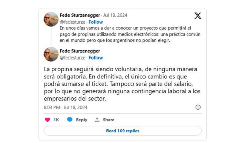 “En definitiva, el único cambio es que podrá sumarse al ticket. Tampoco será parte del salario, por lo que no generará ninguna contingencia laboral a los empresarios del sector”, amplió el funcionario vía X (exTwitter).