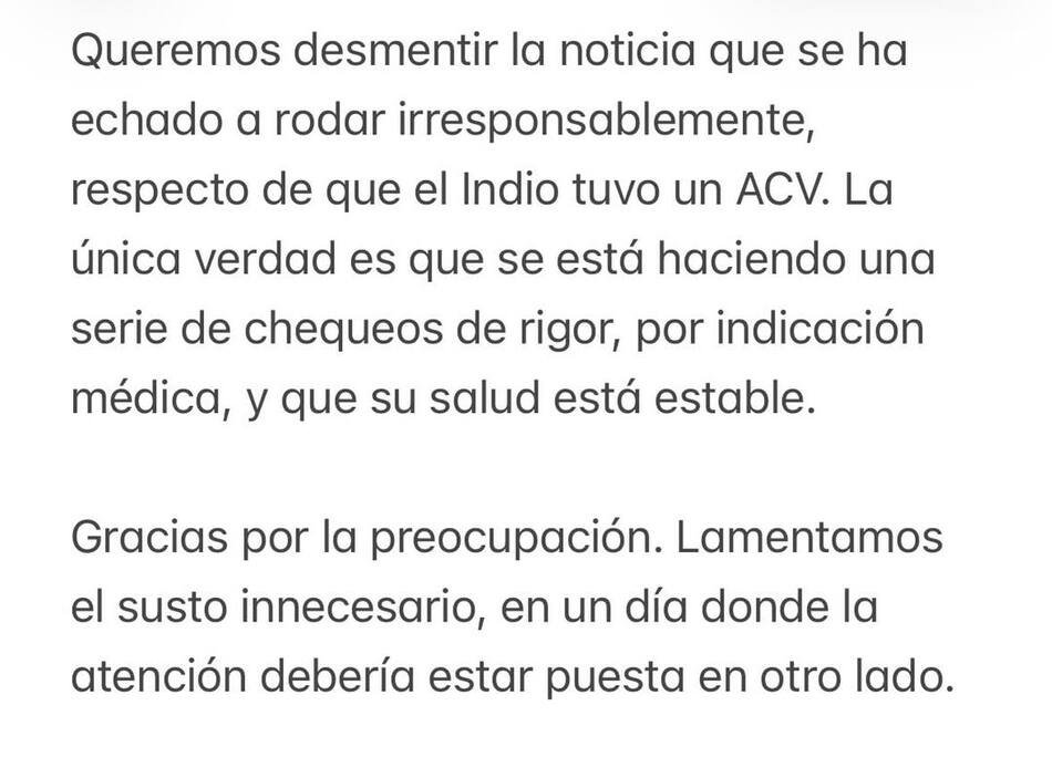 “Queremos desmentir la noticia que se ha echado a rodar irresponsablemente, respecto de que el Indio tuvo un ACV. La única verdad es que se está haciendo una serie de chequeos de rigor, por indicación médica, y que su salud está estable”, explica en primer lugar.