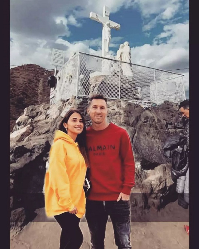 Las redes se inundaron de imágenes en este “finde XXL” en San Luis. Una de estas es una simpática foto en que, supuestamente, el jugador y su esposa le piden la Copa del Mundo al Cristo de la Quebrada.