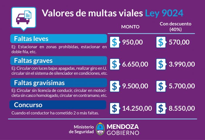 Estas cifras van desde las multas leves, que rondan los $950, hasta los concursos, que tienen un monto de $14.250, pero si se abonan en el plazo de tres días posteriores a la fecha de la infracción, se les aplica un descuento de 40%.