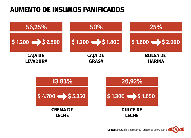 De acuerdo con lo referido por Cristian Di Betta, presidente de la Cámara de Empresarios Panaderos de Mendoza (CEPA), el motivo del aumento responde ni más ni menos que al constante incremento de precios en los insumos que rondan el 50%.