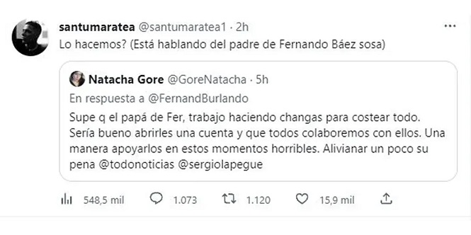 Se trata de un tweet de un usuario llamado Natacha Gore que decidió escribirle a Fernando Burlando, el abogado de la familia Báez Sosa. “Supe que el papá de Fer trabajo haciendo changas para costear todo. Sería bueno abrirles una cuenta y que todos colaboremos con ellos. Una manera de apoyarlos en estos momentos horribles, aliviar un poco su pena”, dice el tweet de la joven, que llegó a oidos de Marate y decidió retrucar la apuesta.
