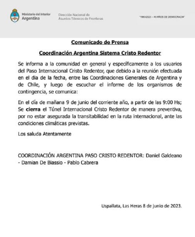 “Se informa a la comunidad en general y específicamente a los usuarios del Paso Internacional Cristo Redentor, que debido a la reunión efectuada en el dia de la fecha, entre las Coordinaciones Generales de Argentina y de Chile, y luego de escuchar el informe de los organismos de contingencia, se comunica: en el día de mañana 9 de junio del corriente año, a partir de las 9:00 Hs; se cierra el Túnel Internacional Cristo Redentor de manera preventiva, por no estar asegurada la transitabilidad en la ruta internacional, ante las condiciones climáticas previstas” informaron desde la Dirección Nacional de Asuntos Técnicos de Fronteras a las 21 de este jueves.