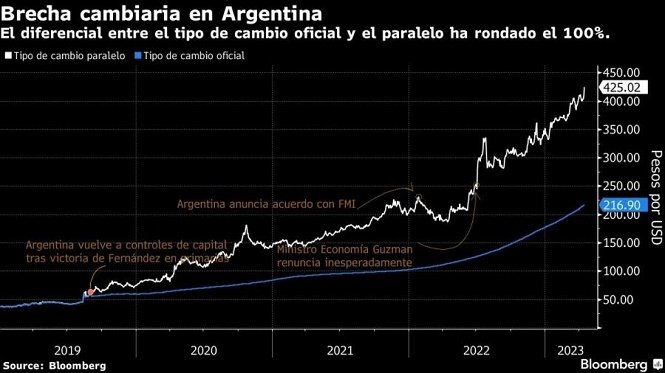 El tipo de cambio paralelo, conocido localmente como blue-chip swap, cayó por quinto día, retrocediendo a un récord de 425 pesos por dólar, antes de reducir las caídas, según datos compilados por Bloomberg a las 14:50 hora local.
