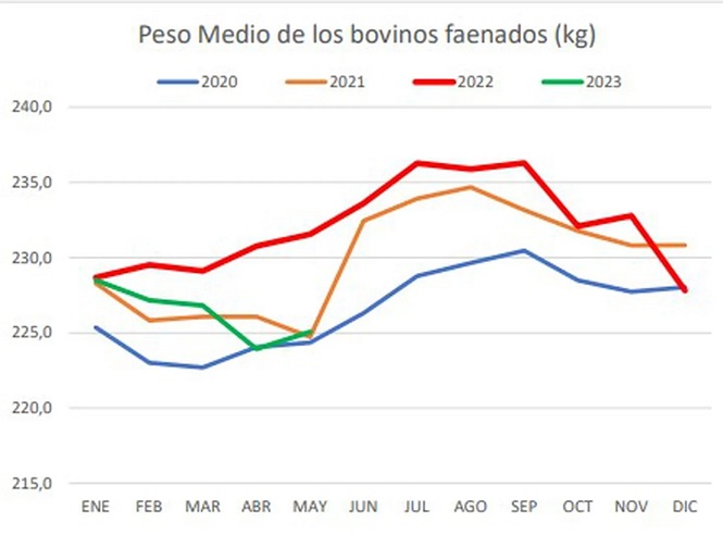 “El peso medio de las carcasas durante los 5 meses que han transcurrido del corriente año se ubicó en 226,3 kilogramos; un 1,6% por debajo de los 230 kilogramos del mismo periodo del año anterior”, detalló el reporte.